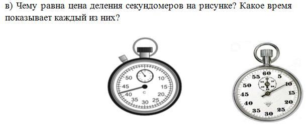 в) Чему равна цена деления секундомеров на рисунке? Какое время показывает каждый из них?