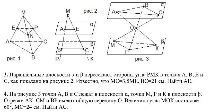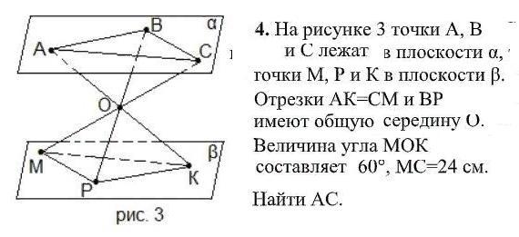 Точки А,В и С лежат в плоскости α, точки М, Р и К в плоскости β. Отрезки АК=СМ и ВР имеют общую середину О. Величина угла МОК составляет 60°, МС=24 см. Найти АС.