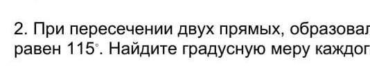 При пересечении двух прямых, образовались углы. Если один из них равен 115°. Найдите градусную меру каждого из полученных углов.