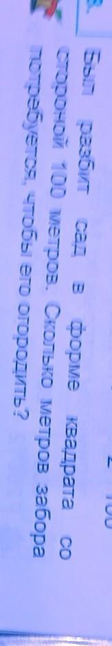 пжпжпж(БЫЛ РАЗБИТ САД В ФОРМЕ КВАДРАТА СО СТОРОНОЙ 100 МЕТРОВ СКОЛЬКО МЕТРОВ ЗАБОРА ПОТРЕБУЕТСЯ ЧТОБЫ ЕГО ОГОРОДИТЬ) надо зделать геометрическим способом и формулами
