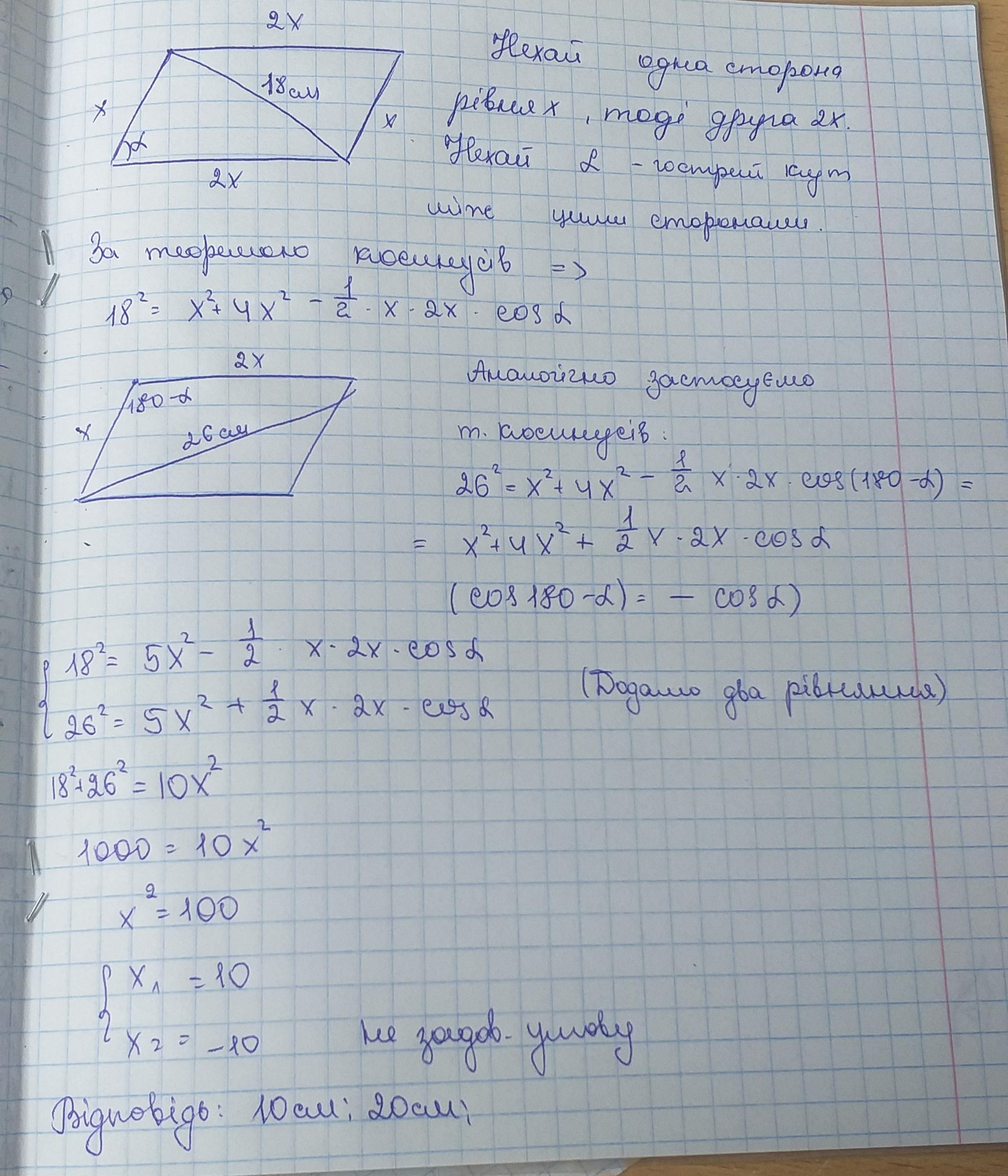 сторони паралелограма відносяться як 1:2, знайдіть сторони паралелограма, якщо його діагоналі 18 см і 26 см