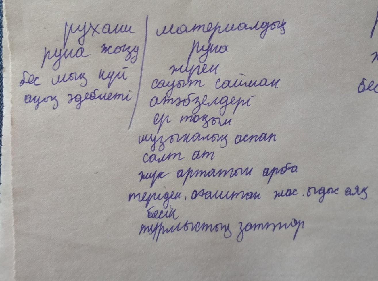 Көне түркілердің рухани мәдениеті мен материалдық мәде ниетін білдіретін сөздерді бөліп, екі бағанға жаз.