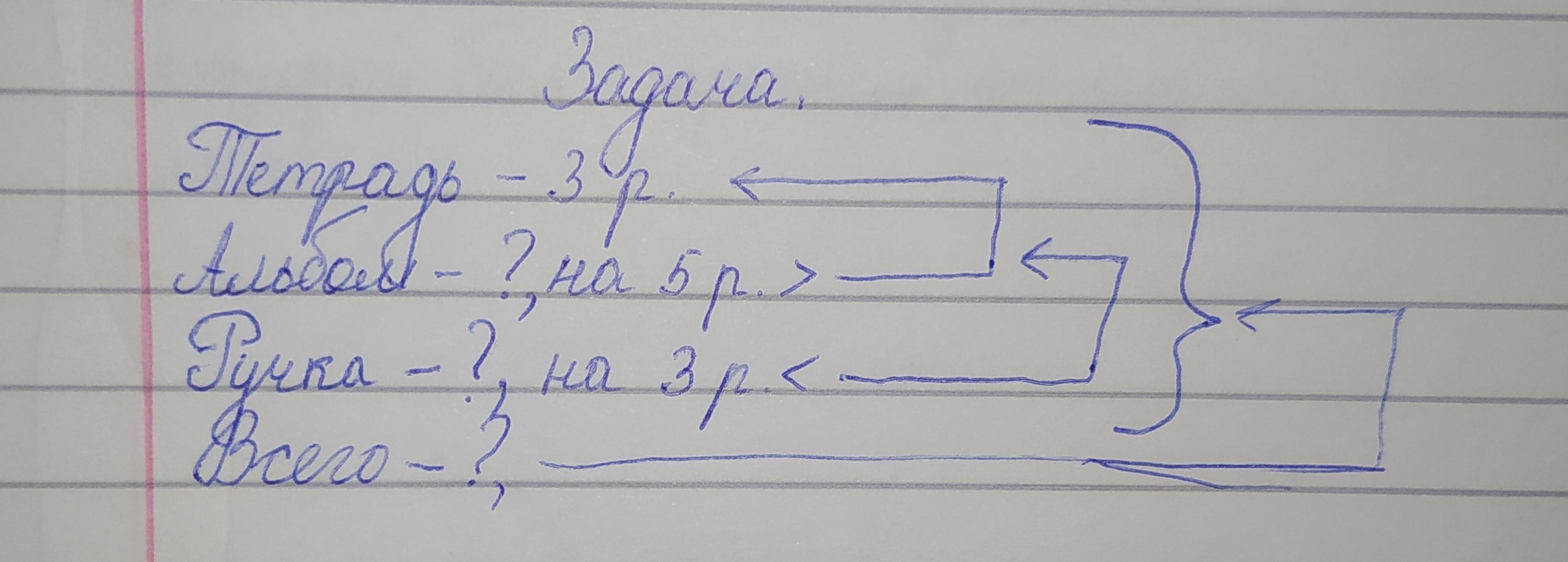 Тетрадь в клетку стоит 3 р., альбом на 5р.,дороже,чем тетрадь,а ручка на 3р.,дешевле, чем альбом. Дополни условие задачи и поставь вопрос так,чтобы задача решалась двумя действиями.