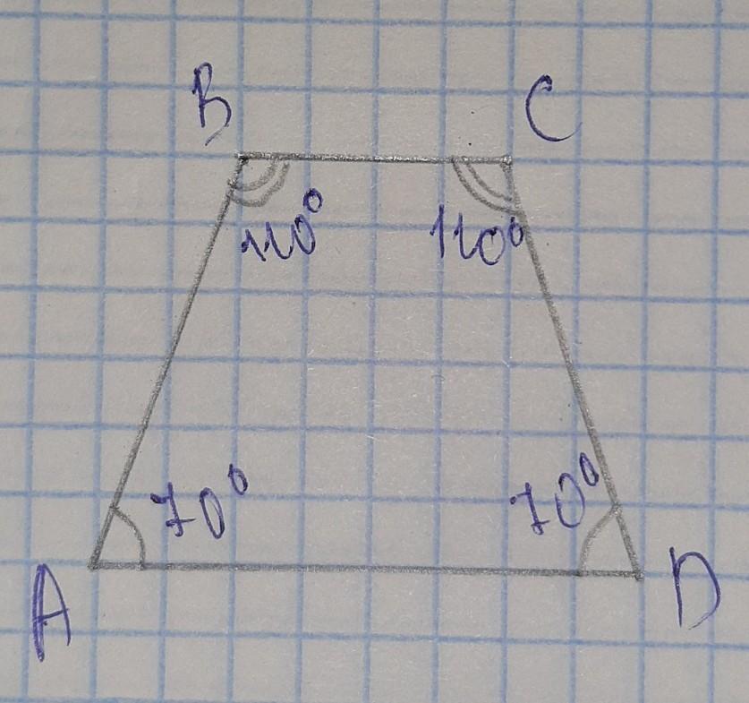 Т.к. трапеция ранобедренная, то углы при основаниях равны, значит угол А = углу D = 70°.