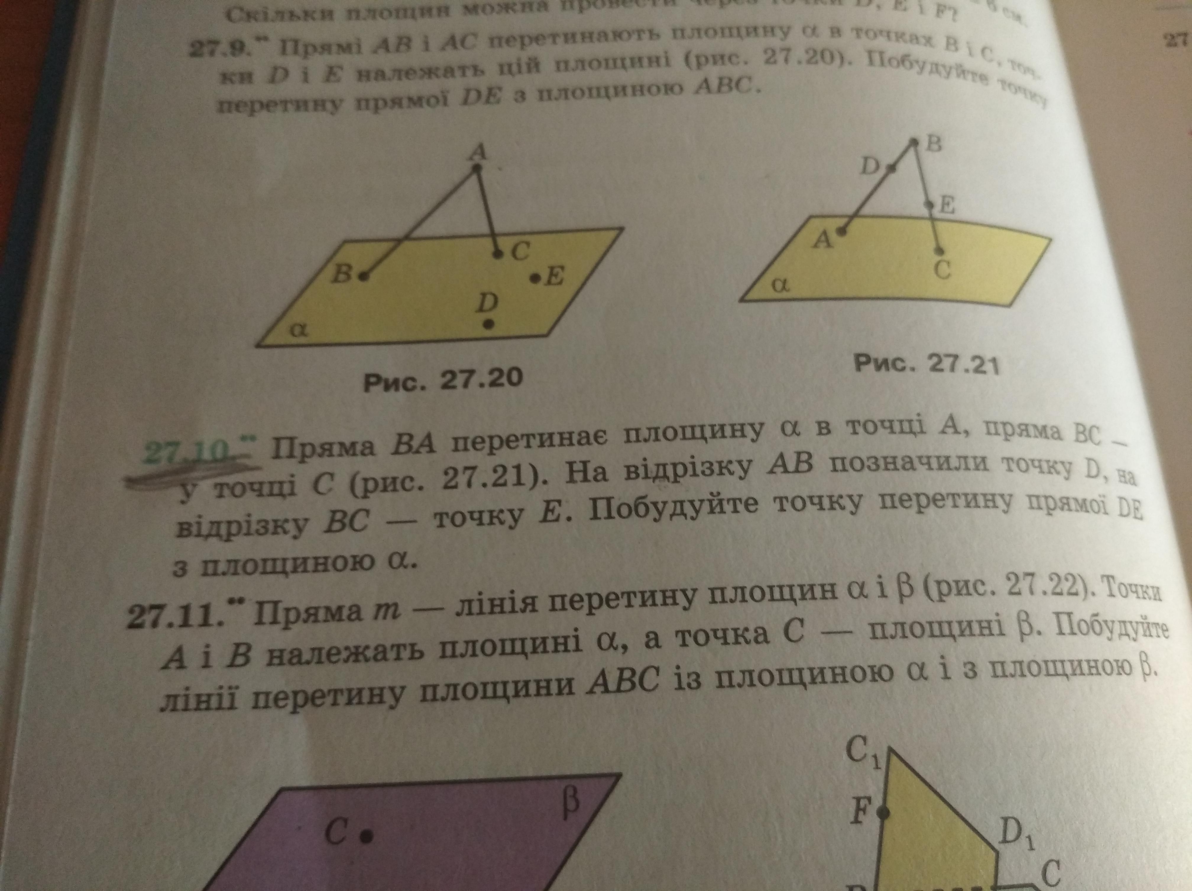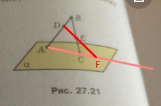 Затем проводим прямую через точки D и Е до пересечения с прямой АС. В пересечении получаем точку F. Это и будет точка пересечения прямой DE с плоскостью α.