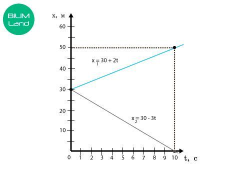 По графику зависимости координаты тела от времени движения определи положение двух тел в пространстве через 5 с после начала движения.