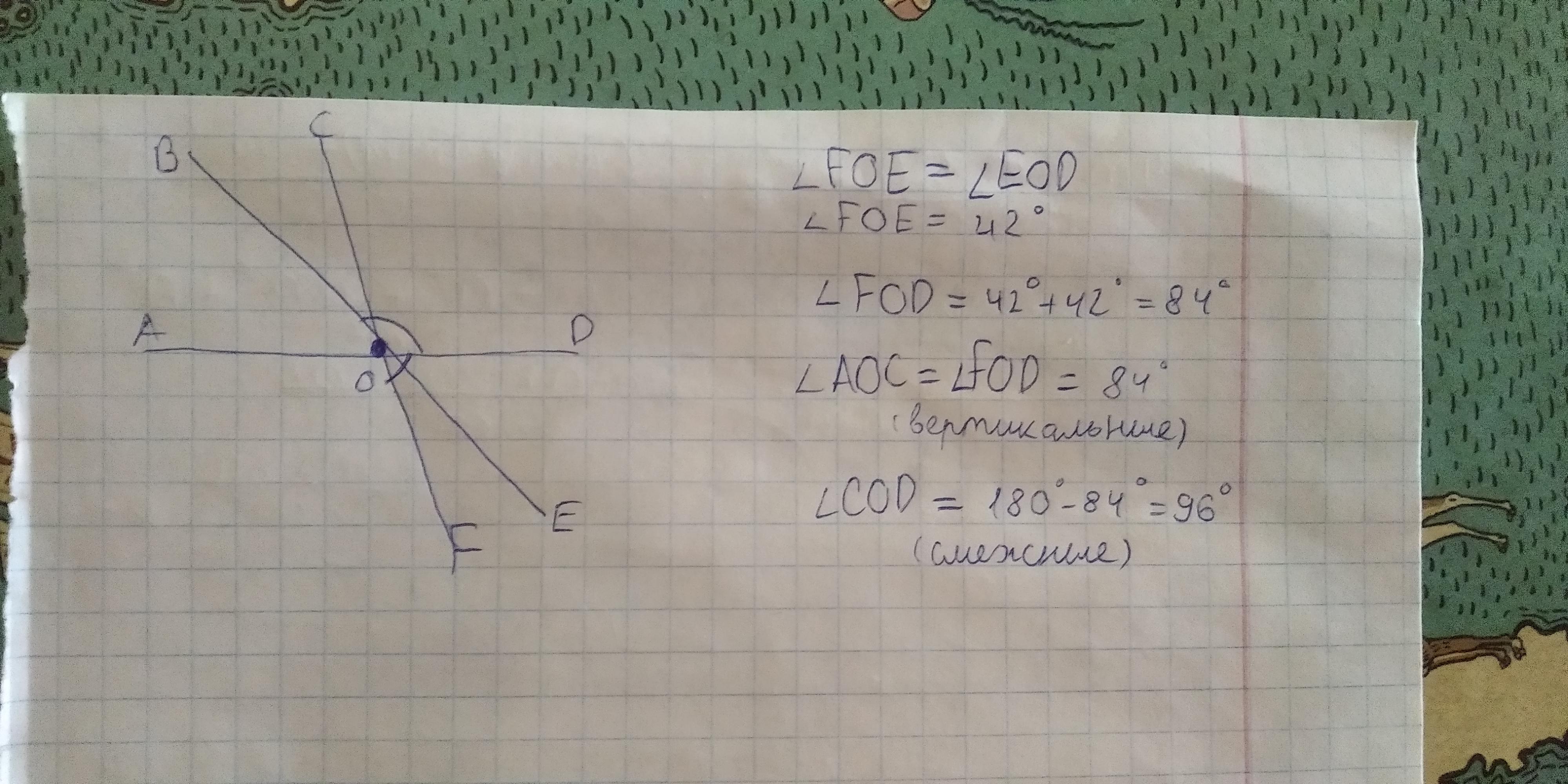 На рисунку 1 прямі "AD", "BE" i "CF" перетинаються в точці "О". Промінь "ОЕ" - бісектриса кута "FOD". Знайдіть кут "BOD", якщо кут "FOE" = 42°