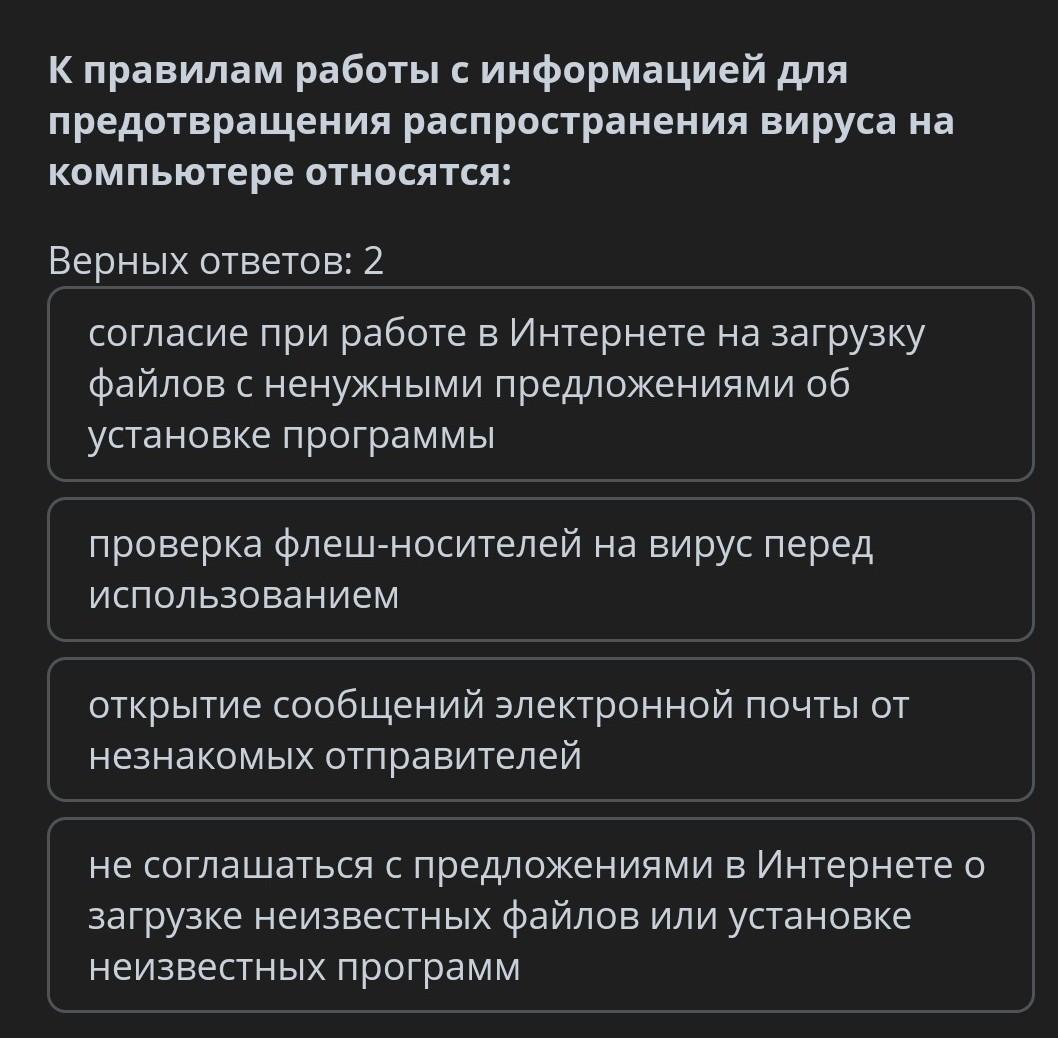 К правилам работы с информацией для предотвращения распространения вируса на компьютере относятся: