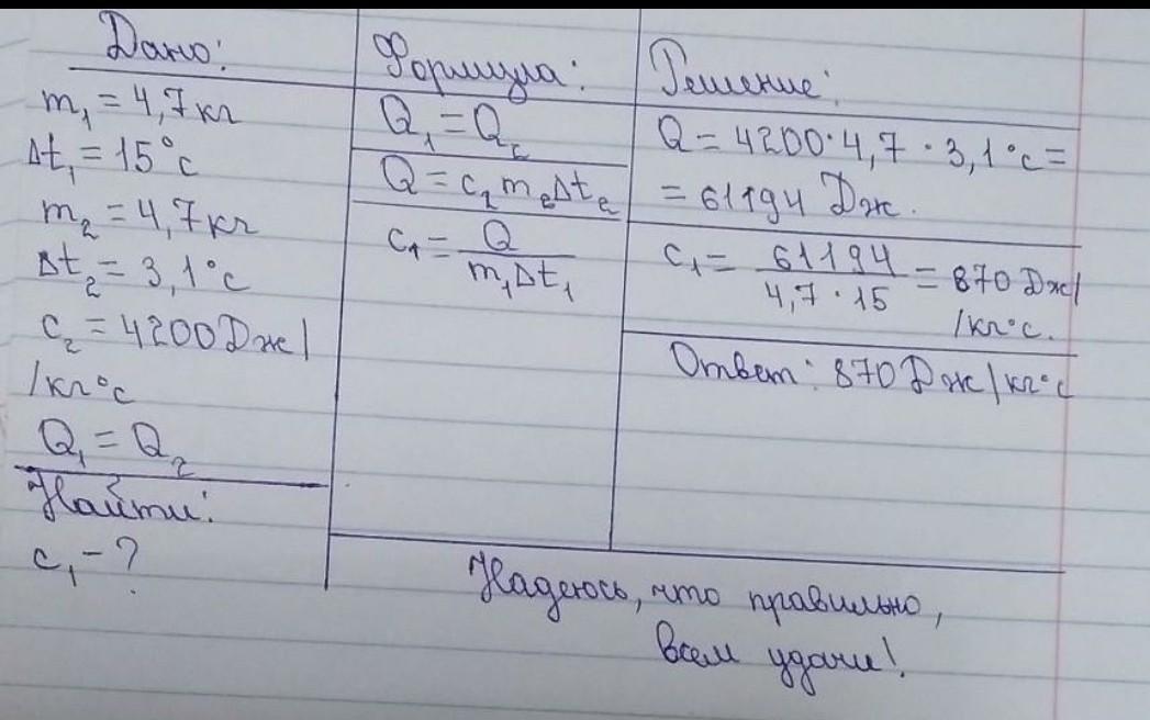 СРОЧНО ДАЮ 50 БАЛЛОВ !!!На нагревание кирпича массой 5,7 кг на 11°C затрачено такое же количество теплоты, как и для нагревания 5,7 кг воды на 2,3°C. Определи удельную теплоёмкость кирпича. Удельная теплоёмкость воды равна 4200 Дж/(кг·°C).