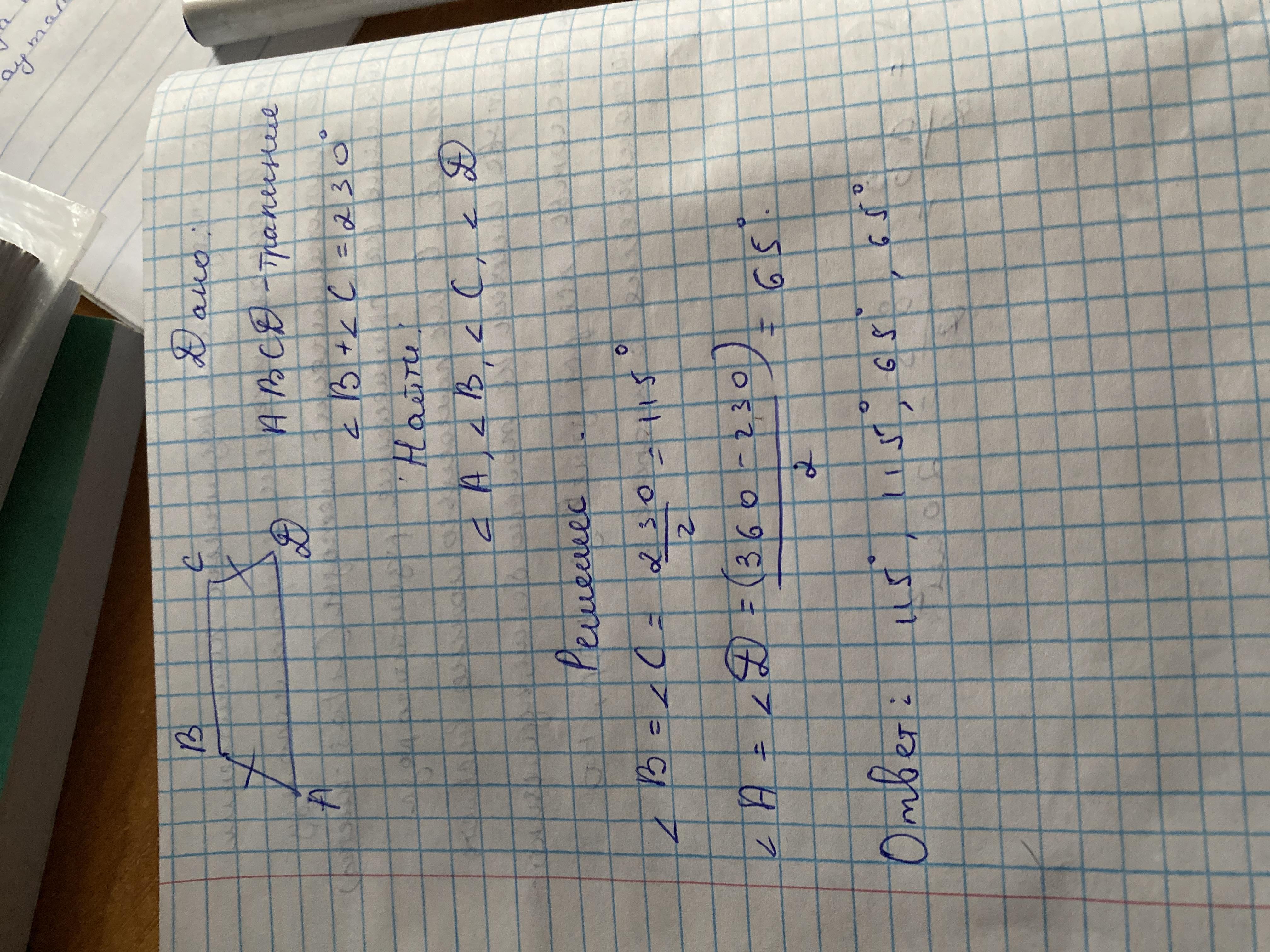 Дам 18 баллов спочно помогите пж.в равнобокой трапеции сумма углов при меньшем основании равна 230°. найдите углы трапеции.помогите пожалуйста
