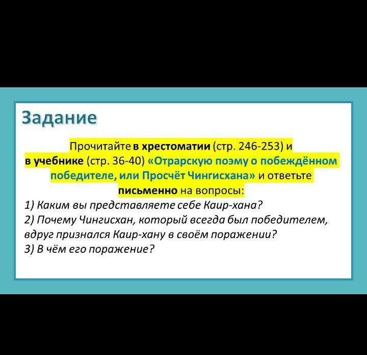 прочитайте в хрестоматии (стр. 246-253) и в учебнике стр. 36-40 "Отрарскую поэму о побеждённом победителе, или Просчёт Чингисхана: и ответьте письменно на вопросы (вопросы на фото)