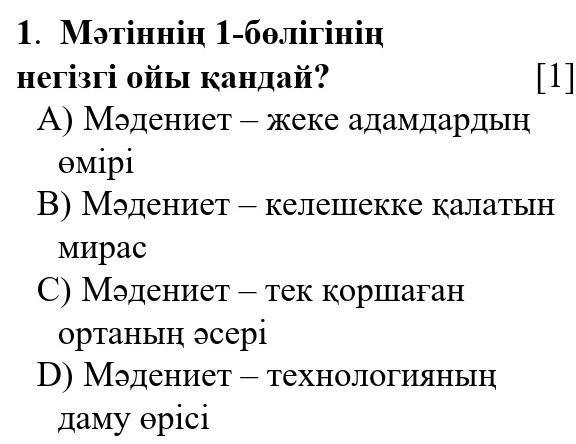 Менің ойымша,«В» болады.Мәдениет-келешекке қалатын мирас.Қалған жауаптар дұрыс емес секілді