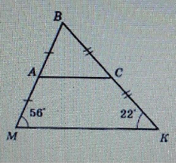 АС - средняя линия, значит, ΔАВС подобен ΔМВК, а ∠ВАС=∠ВМК=56°, ∠АСВ=∠ВКМ=22°.