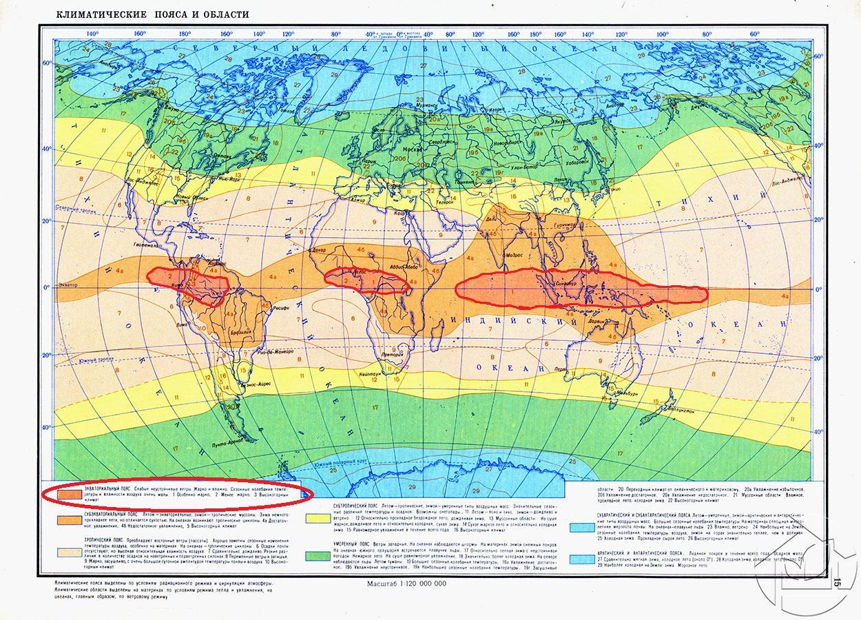 Из карт климатических поясов и воздушных масс следует, что в экваториальном климатическом поясе преобладают экваториальные воздушные массы (ЭВМ).