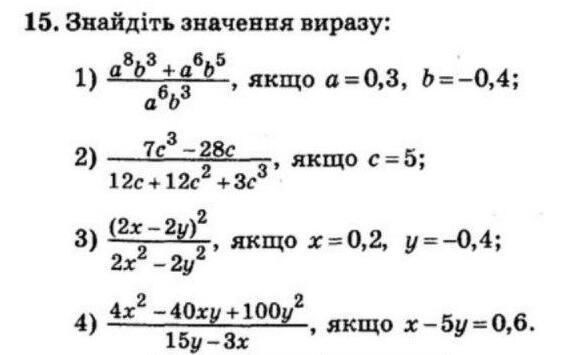 Объяснение:Сокращяешь дробь, получается 20у-4х/15у-3х, меняешь знак у дроби и соответственно знаки в какойто части, пусть будет в верхней, получается 4х-20у/3, выносм в верхней части 4, 4(х-5у)/3. А у тебя дано что х-5у=0,6. Получается ответ 4*0,6:3=0,8