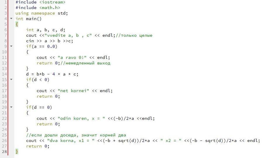cout << "dva korna, x1 = " <<(-b + sqrt(d))/2*a << " x2 = " <<(-b - sqrt(d))/2*a << endl;