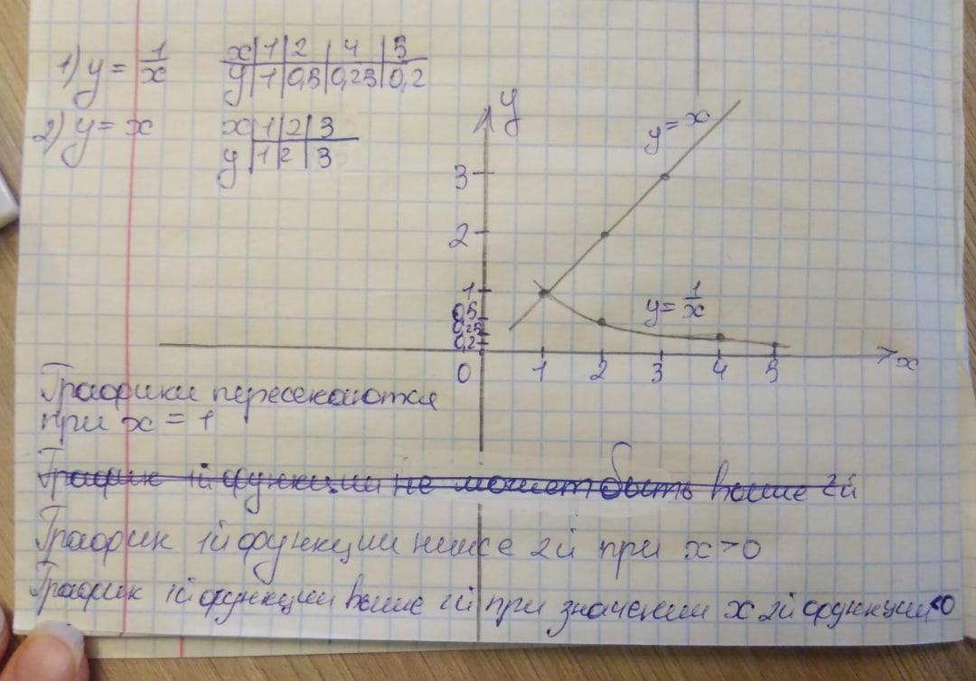 На одной координатной плоскости постройте графики функций y=1/x и y=x Определите при каких значениях x:Графики этих функций пересекаются. Графики первой функции расположен выше (ниже) графика второй функции. Можно с доскональным решением