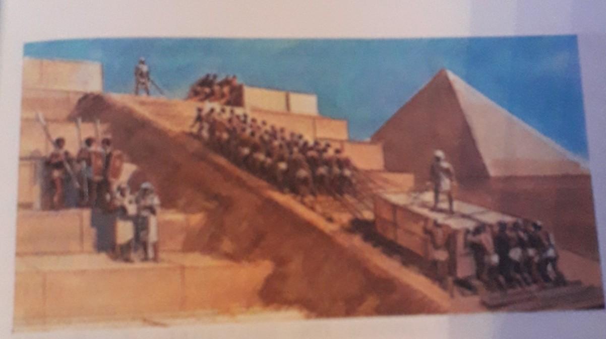 На картинке мы видим, как происходило строительство пирамиды. На переднем плане десятки рабов поднимают огромный выточенный из камня блок. Чтобы было легче тащить этот блок, под него подложены брёвна. Но мы всё равно видим, что рабы с огромным трудом тащат его. Рабами управляет надсмотрщик. В руках у него кнут, которым он подгоняет их. На заднем плане мы видим ещё одну группу рабов. Ими управляет другой надсмотрщик. Вдали виднеется ещё одна пирамида. Её тоже строила не одна сотня рабов. Пирамиды - своеобразный памятник тяжёлому рабскому труду.
