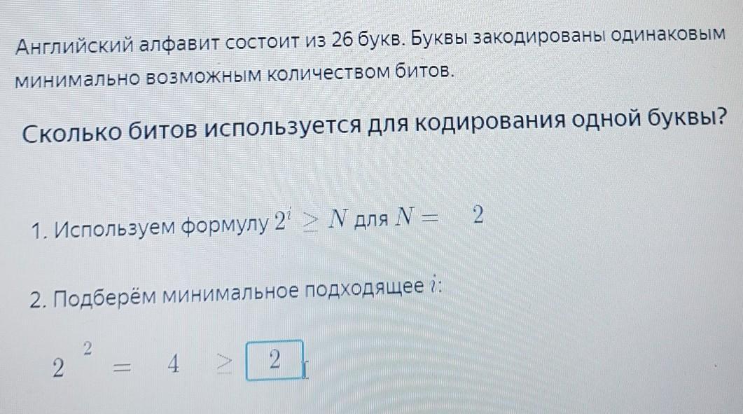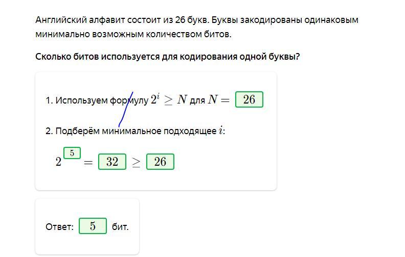 Английский алфавит состоит из 26 букв. Буквы закодированы одинаковым минимально возможным количеством битов.