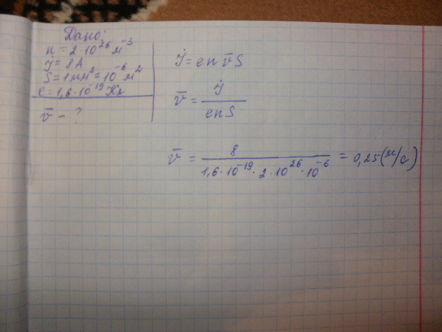 у провіднику в кожному кубічному метрі міститься 2*1026 вільних електронів. з якою середньою швидкістю електрони упорядковано рухаються через провідник,якщо сила струму в ньому 8А. площа поперечного перерізу провідника становить 1 мм2