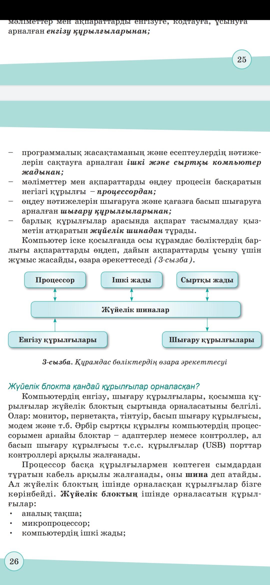 Ответ: Жүйелік шинаның бөліктері: 1)Процессор; 2)Ішкі жады; 3)Сыртқы жады.