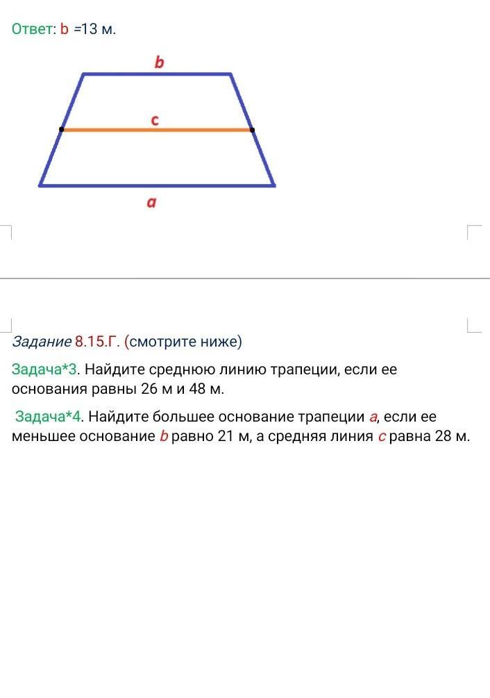 Найдите большее основание трапеции а, если ее меньшее основание b равно 21 м, а средняя линия с равна 28 м