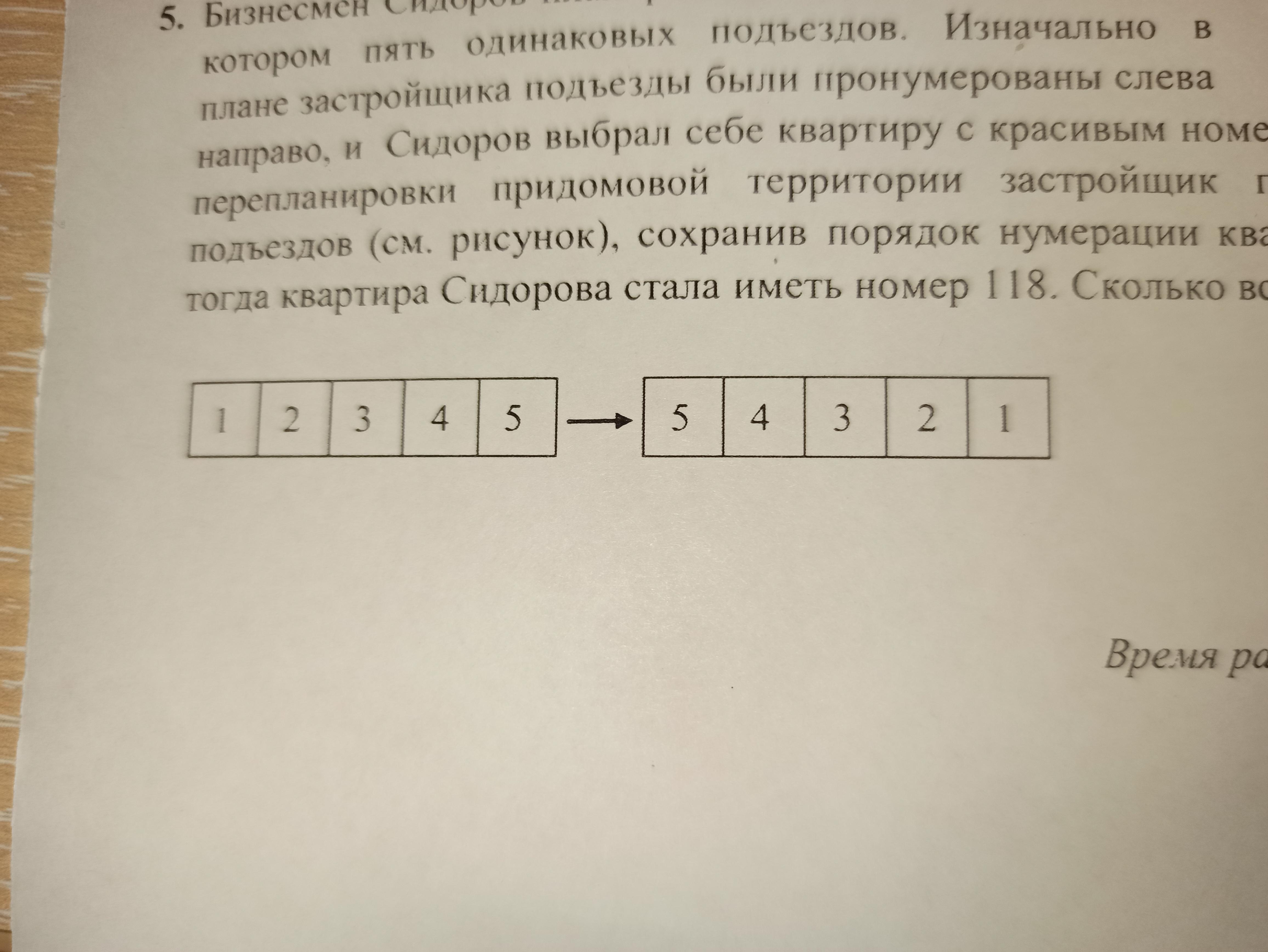 Бизнесмен сидоров планировал въехать в новый дом, в котором пять одинаковых подъездов. Изначально в плане застройщика подъезды были пронумерованы слева направо, и сидоров выбрал себе квартиру красивым номером «300». но после перепланировки придомовой территории застройщик поменял нумерацию подъездов (см. рисунок), сохранив порядок нумерации квартир в подъезде. и тогда квартира сидорова стала иметь номер 118. сколько всего квартир в доме?