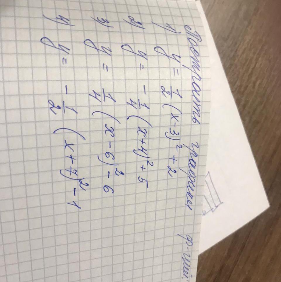 4) График функции x² сдвинут на 7 единиц влево и опущен на 1 вниз, ветки параболы вниз, сам график расширен в 2 раза