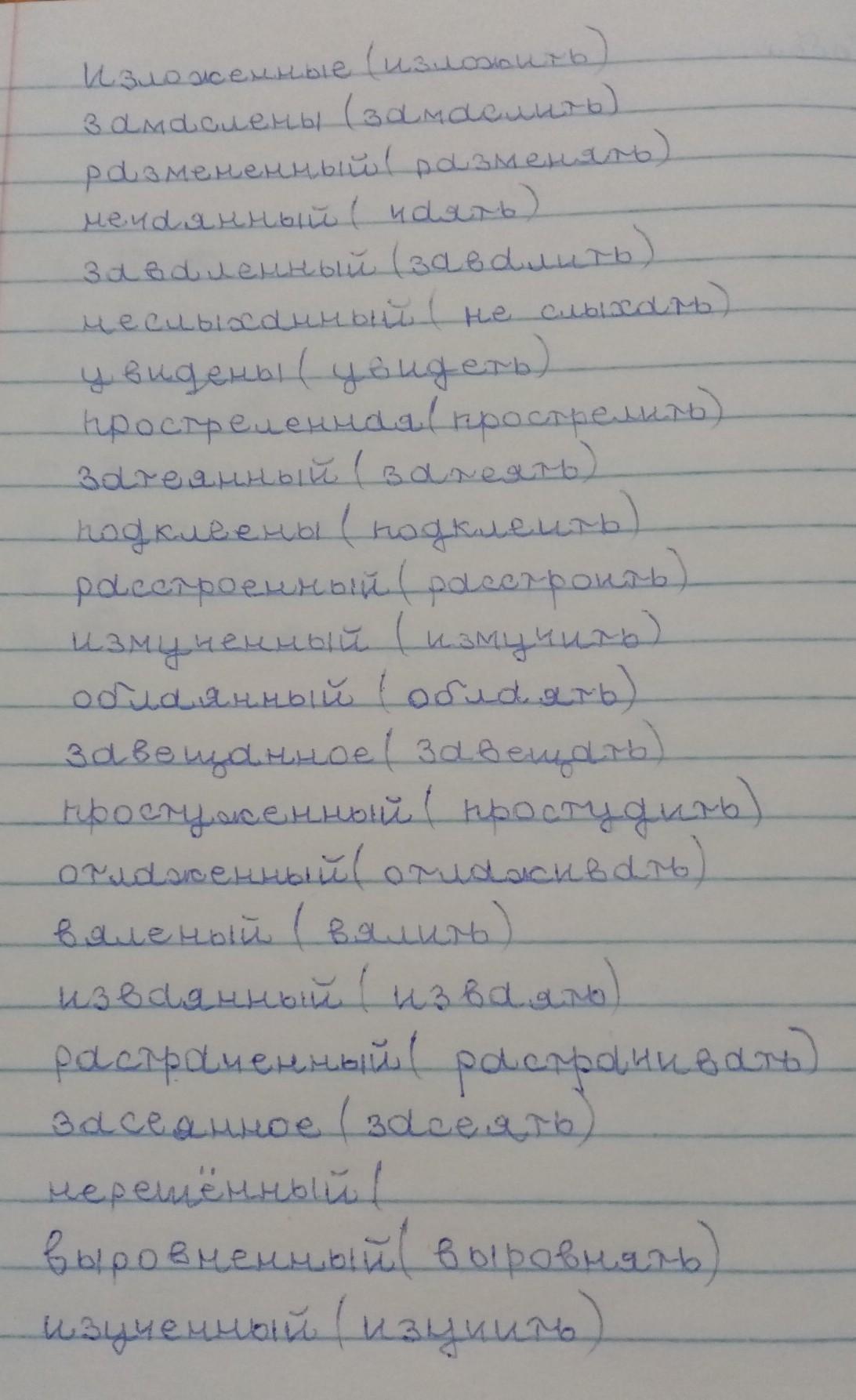 Излож_нные, замасл_ны, размен_нный, неча_нный, завал_нный, неслых_нный, увид_ны, прострел_нная (рука), зате_нный, подкле_ны, расстро_нный, измуч_нный, обла_нный, завещ_нное, простуж_нный, отлаж_нный, вял_ный, изва_нный, растрач_нный, засе_нное, нереш_нный, выровн_нный, изуч_нный, распах_нный, запа_нный.