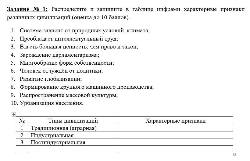 Распределите и запишите в таблице цифрами характерные признаки различных цивилизаций.
