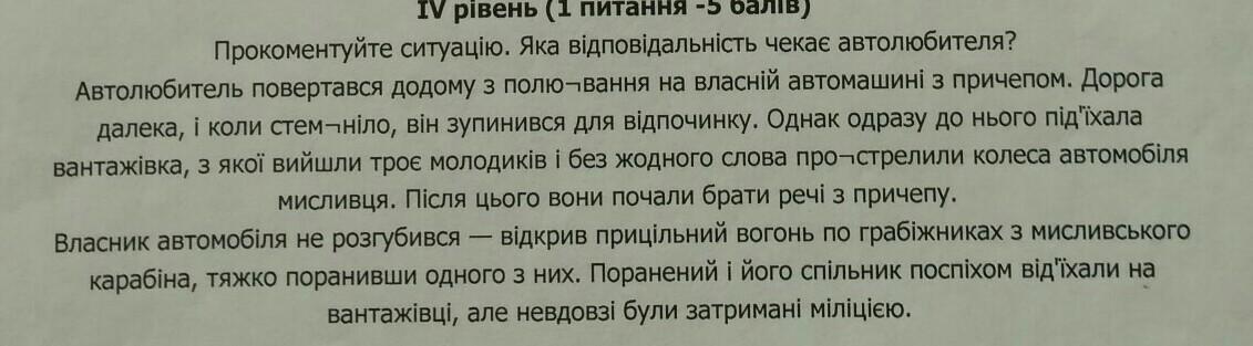 Якщо у автолюбителя була мисливська зброя, то скоріше за все вона була належним чином зареєстрована. На нього було здійснено озброєний напад, тому що нападники одразу ж прострелили колеса автомобіля, що стало причиною неможливості втечі. Крім того, напад здійснено групою осіб – троє молодиків, які почали його грабувати або скоріше за все взагалі здійснили розбійницький напад (якщо у них була зброя, то думаю, що вони нею погрожували) . Автолюбитель з метою захисту свого життя і майна відкрив вогонь і ранив одного з нападників. Вважаю, що його дії є необхідною обороною.