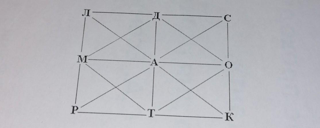 Составте слова по схеме. Надо прочитать и записать как можно больше слов. Читать можно по всем линиям и во всех направлениях, можно возвращаться к одной и той же букве, но нельзя перескакивать с одной буквы на другую.