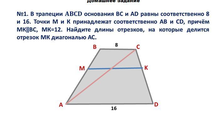 Из условия получаем, что МК - средняя линия трапеции, так как (8 + 16)/2 = 12.