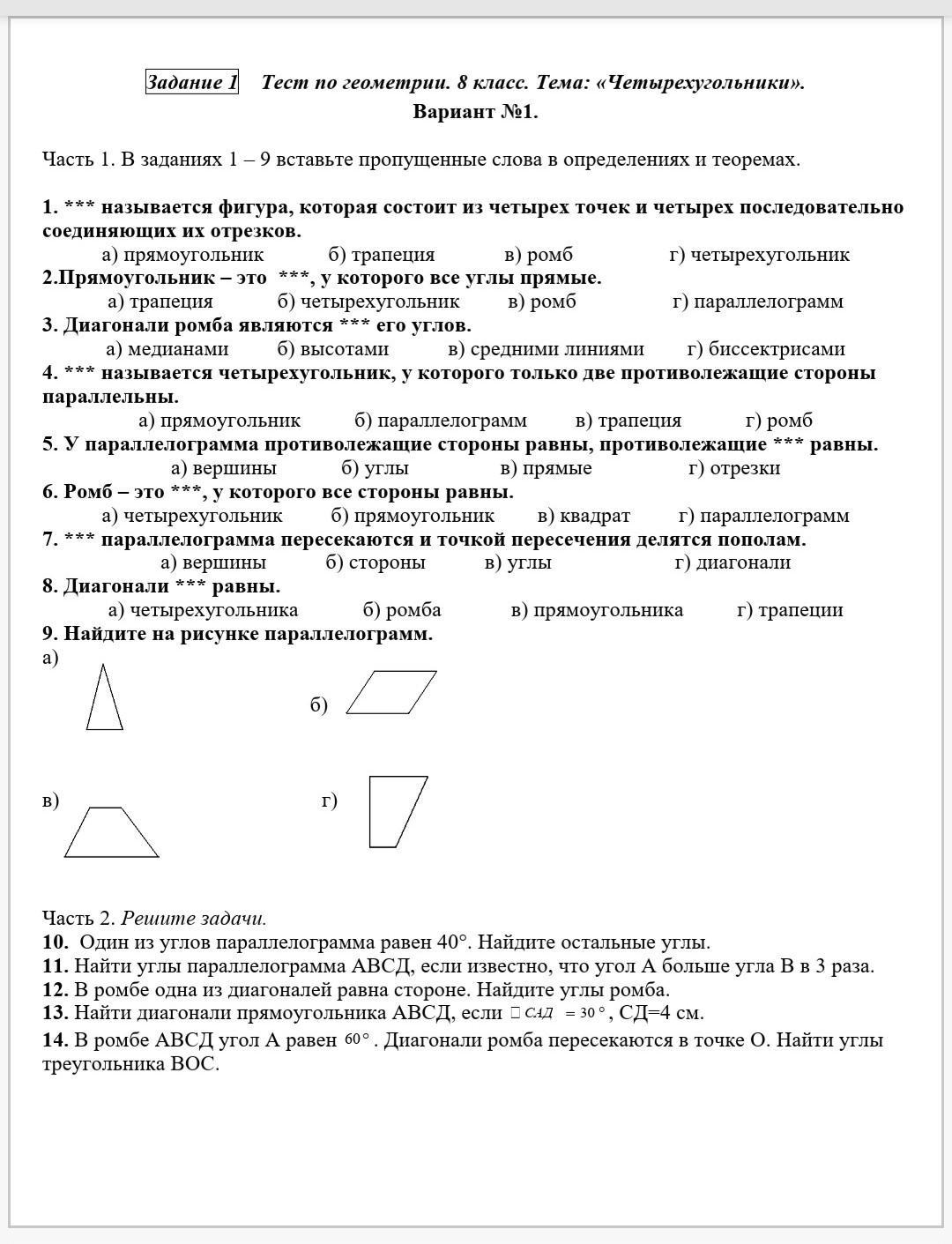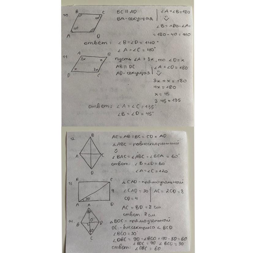 10) Если угол 40 , то противоположный угол тоже 40. На два остальных угла останется 360-2*40=280. А тк противоположные углы равны , то 280:2=140 . Значит два остальных противоположных угла по 140.