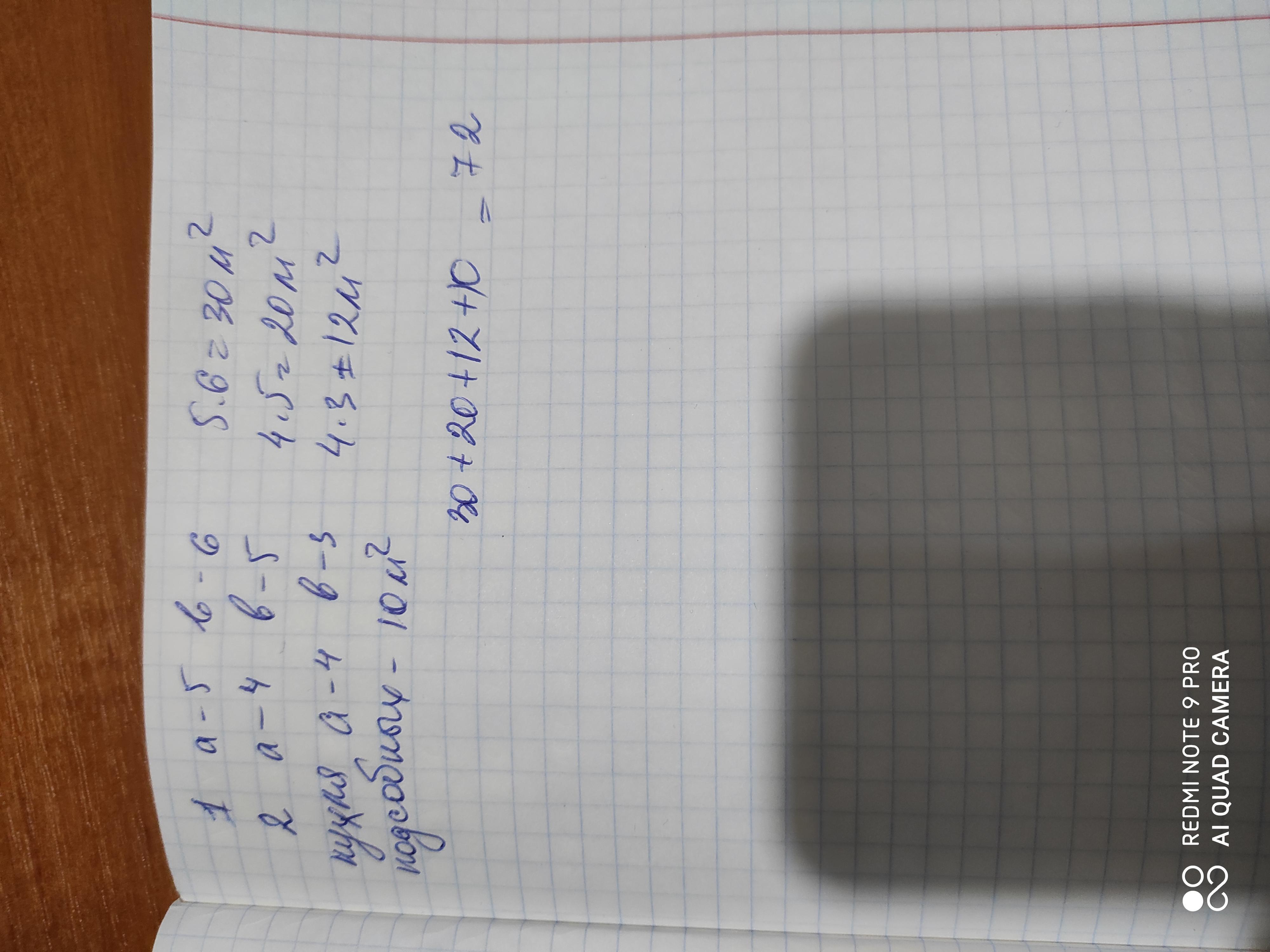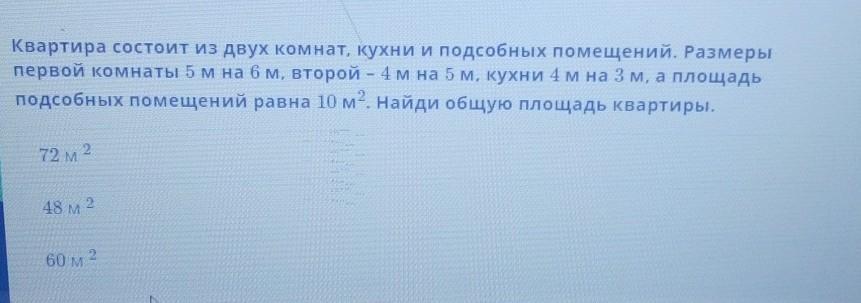 Квартира состоит из двух комнат кухни и подсобных помещений размеры первой комнаты 5 м на 6 м второй 4М на 5М кухни на 4М на 3М A площадь подсобных помещений равна 10 м квадрате Найдите общую площадь квартиры