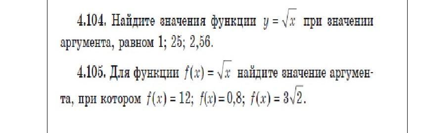 #4. 104.найдите значения функции у=корень из х при значении аргумента, равном 1;25;2;56.