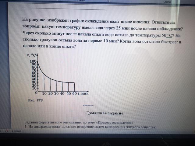 Из графика видно что вода в начале опыта остывала быстрее (кривая круче идет вниз в начале чем в конце)