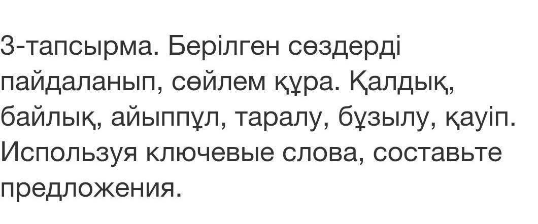3-тапсырма. Берілген сөздерді пайдаланып, сөйлем құра. Қалдық, байлық, айыппұл, таралу, бұзылу, қауіп