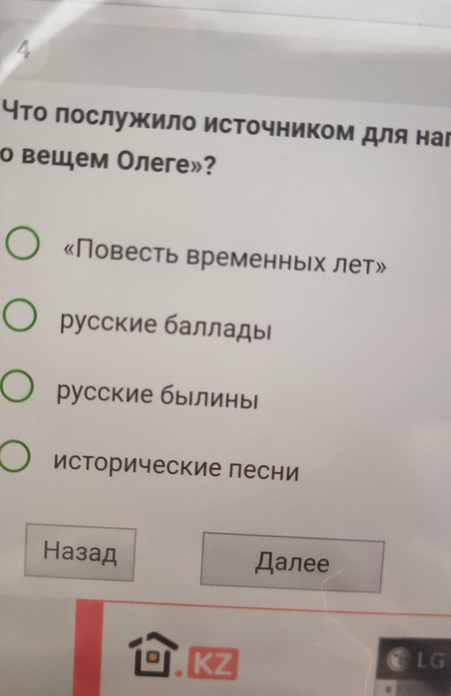 В основу баллады “Песнь в вещем Олеге” была положена запись о походе князя Олега, которая является частью “Повести временных лет” - летописи Нестора.