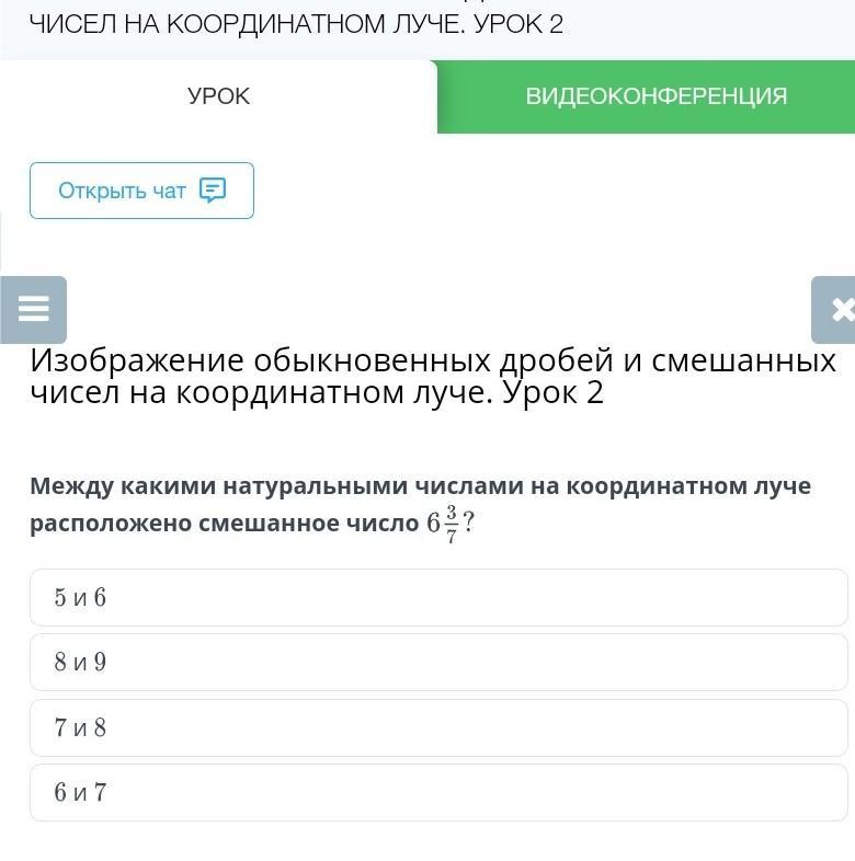 11:06 ONLINE МЕКТЕР Русский ИЗОБРАЖЕНИЕ ОБЫКНОВЕННЫХ ДРОБЕЙ И СМЕШАННЫХ ЧИСЕЛ НА КООРДИНАТНОМ ЛУЧЕ. УРОК 2 УРОК ВИДЕОКОНФЕРЕНЦИЯ Открыть чат Изображение обыкновенных дробей и смешанных чисел на координатном луче. Урок 2 Между какими натуральными числами на координатном луче расположено смешанное число 62? 5 и 6 8 и 9 7 и 8 6 и 7 + Назад В Проверить 37106628 1206574 21734