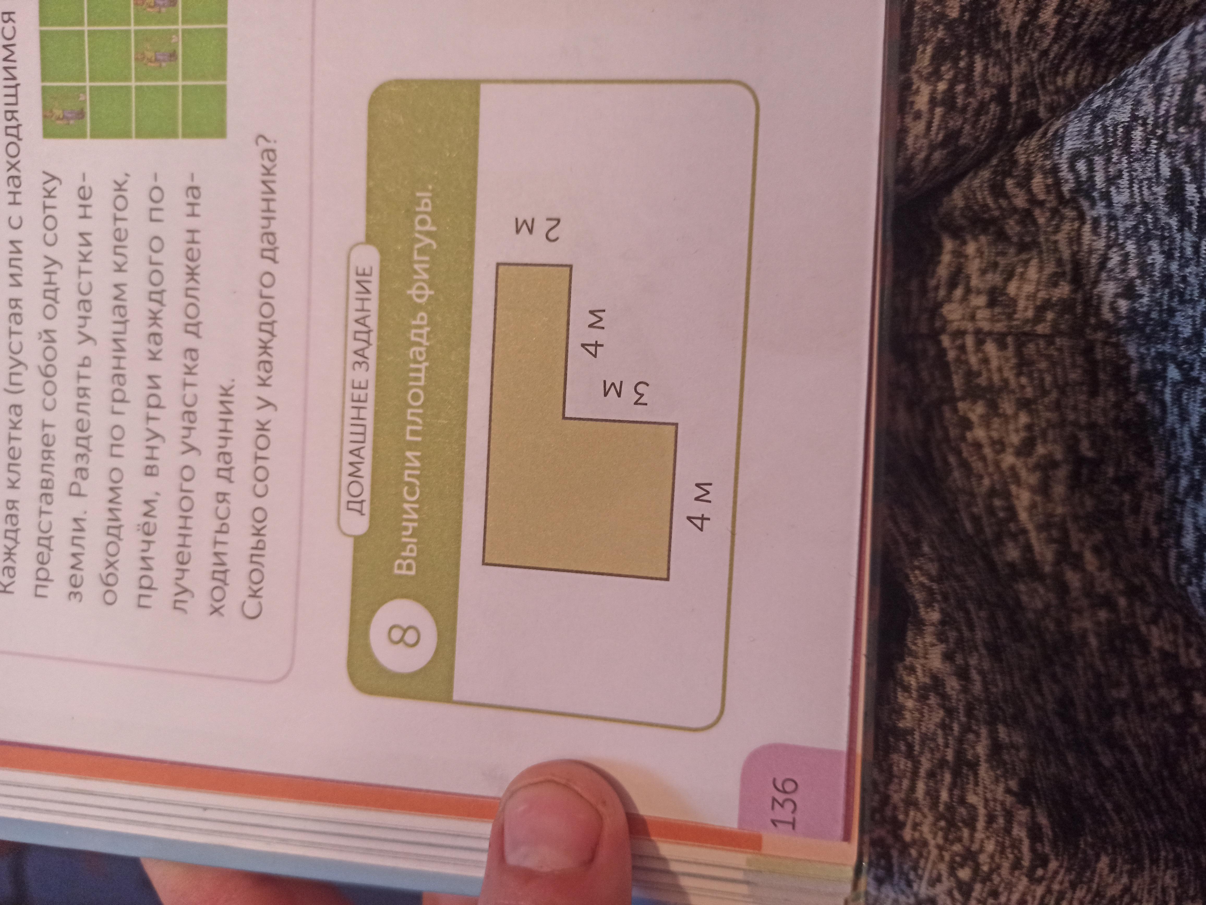 4 x ( 3 + 2 ) = 20 м2 большой прямоугольник