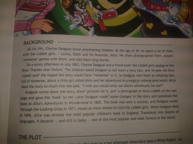 В Солнечный день в июле 1862 года, Chartes Oodeson и подруга взяла* Uddetl Гиртс гребле на fttver Темзы близ Оксфорда. Дети спросил Доджсон, чтобы рассказать им сказку, и 10-летняя Алиса Лидделл заявил,* она надеялась, что история будет иметь “бред|. Так сказал Доджсон, их удивительная сказка, полный бред, о маленькой девочки по имени Алиса и ее Приключения в волшебный подземный мир. AHce понравилась история настолько, что она сказала, - я бы очень хотел написать Приключения алисы для mel*