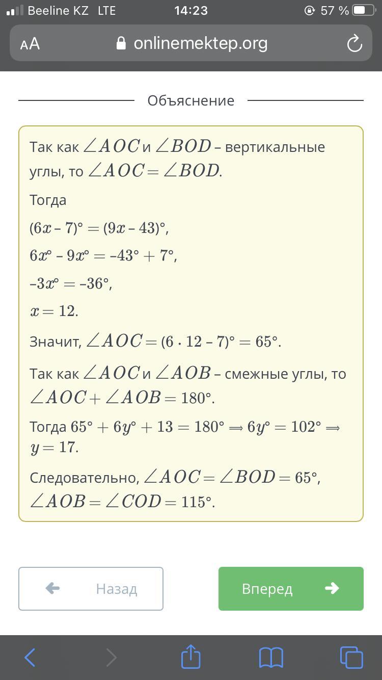 AD и BC – пересекающиеся прямые. Используя рисунок, выбери верные варианты. Верных ответов: 3 ∠AOC = 65° ∠AOB = 65° y = 12 x = 12 ∠AOC = 115° ∠COD = 115°