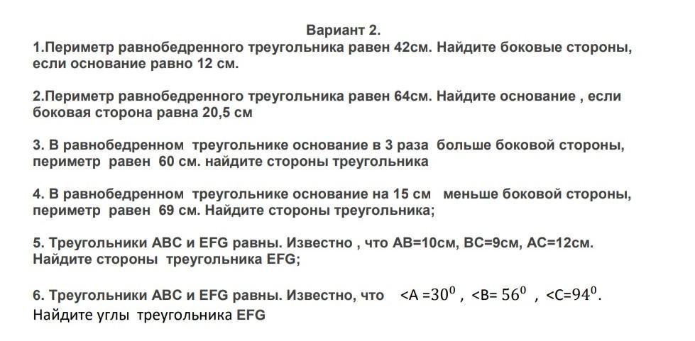 5) так как мы не знаем углов, то стороны будут такими же. ЕF=10, FG=9 EG=12, потому что треугольники равны, то есть их стороны равны