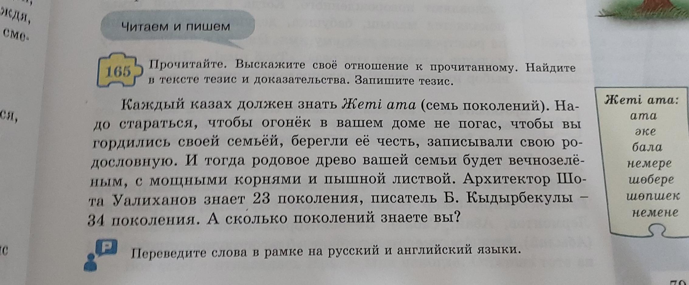 165. Прочитайте. Выскажите своё отношение к прояитанному. Найдите в тексте тезис и доказательство. Запишите тезис. Каждый казах должен знать семь поколений. На-до стараться, чтобы огонёк в вашем доме не погас, чтобы вы гордились своей семьёй, берегли её часть, записывали свою родословную. И тогда родовое древо вашей семьи будет вечнозелёным, с мощными корнями и пышной листвой. Архитектор Шота Уалиханов знает 23 поколения, писатель Б. Кыдырбекулы - 34 поколения. А сколько поколений знаете вы?
