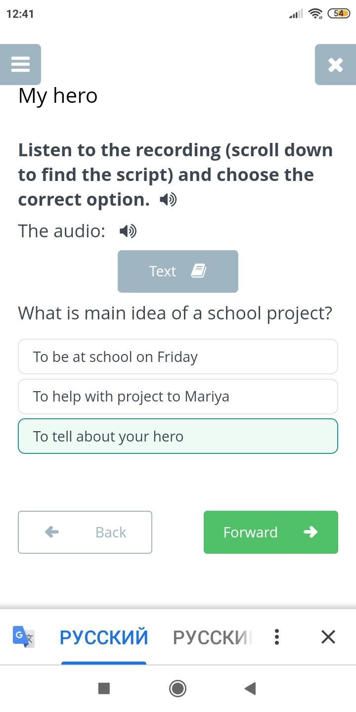 What is main idea of a school project? To tell about your hero To be at school on Friday To help with project to Mariya
