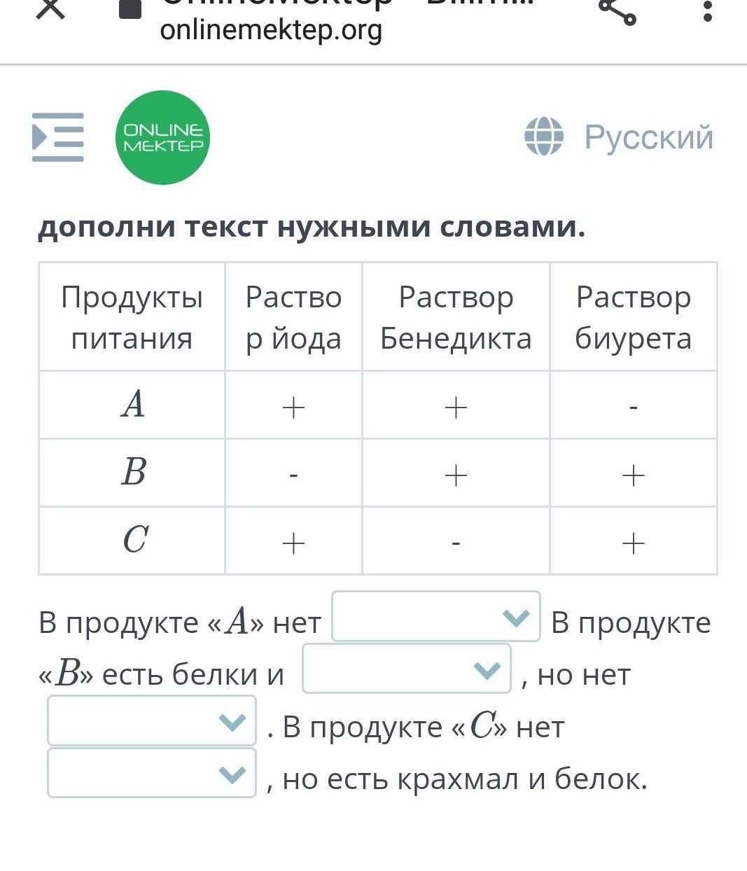 Ответ: в продукте "А" нет белка в продукте "В" есть белки и глюкоза, но нет крахмала. В продукте "С" нет глюкозы, но есть крахмал и белок.