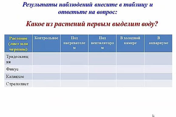 Заполните таблицу и ответьте на вопрос . Какое из растений выделит воду первым.
