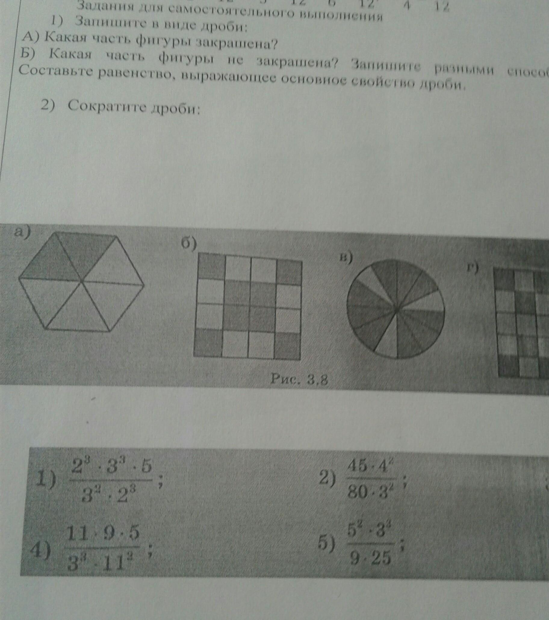 запиши виде дроби а) какая часть фигуры закрашина б) какая часть фигуры не закрашина . запишите разными спосабпми . составте равенство выражающее основное своесто дроби.