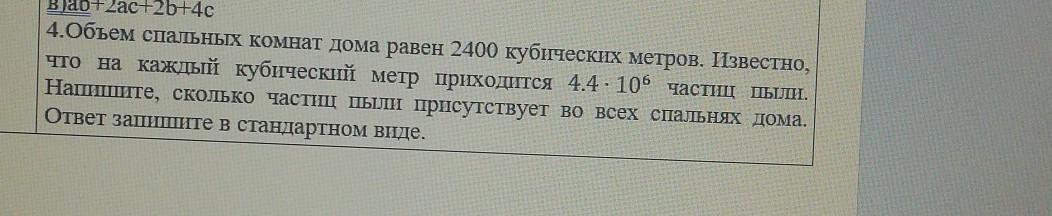 объём спальных комнат дома равен 2400 кубических метров известно что на каждый кубический метр приходится 4,4 X 10^6 частиц пыли напиши сколько частиц пыли присутствует во всех спальнях дома ответ запиши в стандартном виде